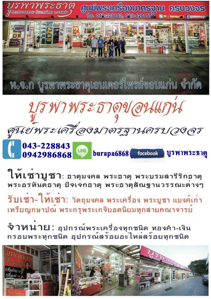 บูรพาพระธาตุแก่น เป็นศูนย์พระเครื่อง มาตรฐาน ครบวงจร ที่ใหญ่ที่สุดในขอนแก่น และภาคตะวันออกเฉียงเหนือ ซึ่งเปิดให้บริการทุกวัน ไม่เว้นวันหยุดราชการ และวันนักขัตฤกษ์ ตั้งแต่เวลา ๐๙.๐๐ น. ถึง ๒๑.๐๐ น.สถานที่ตั้งร้าน ตลาดตองแปด๘๘๘ ถนนรื่นรมย์ ตำบลในเมือง อำเภอเมืองขอนแก่น จังหวัดขอนแก่น บริหารงานโดยคุณบูรพา ลี้มหามงคลกุล(เฮียบ๊วยบูรพา)รองประธานชมรมรักษ์พระบรมธาตุจังหวัดขอนแก่น